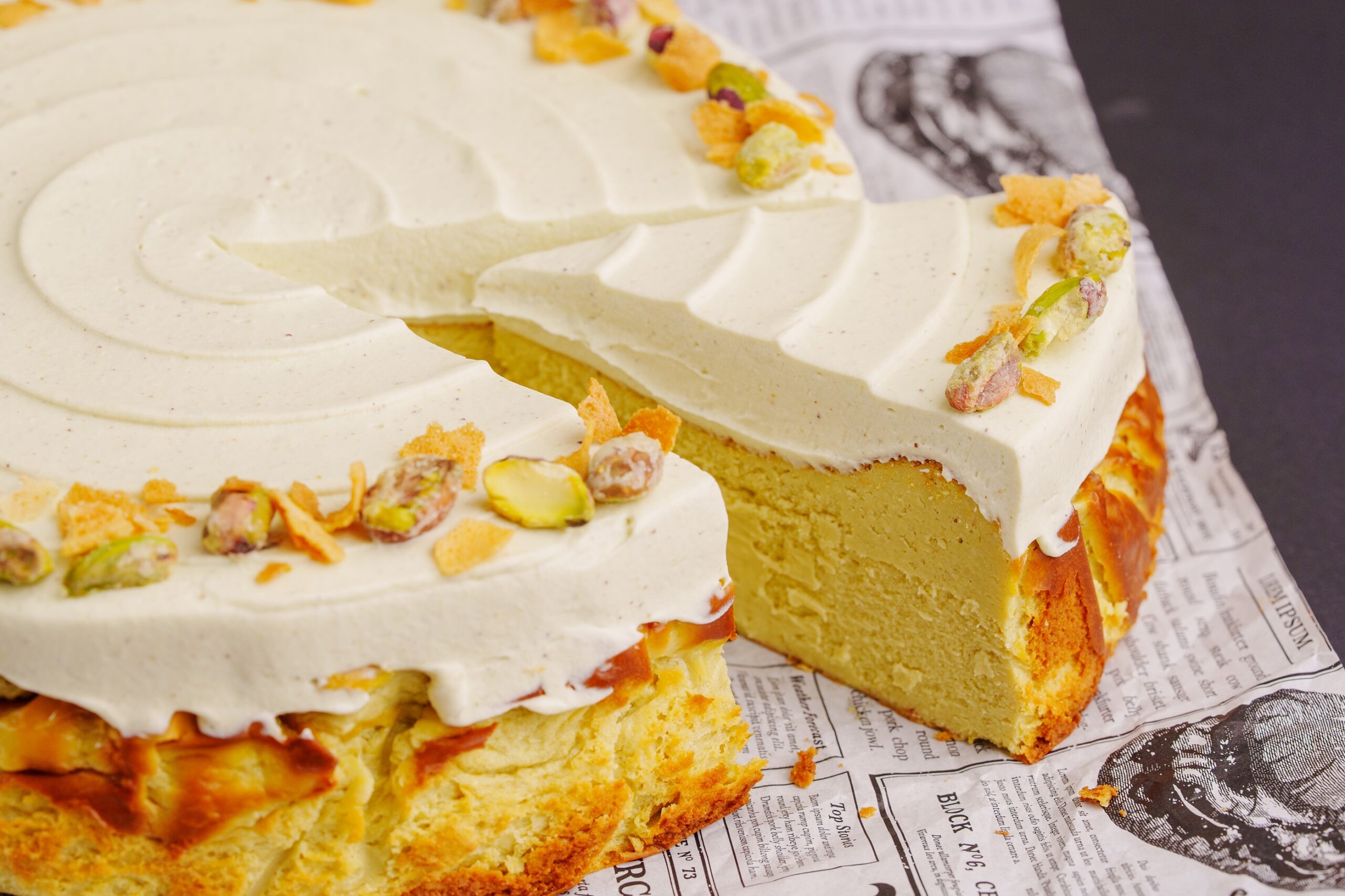 Pistachio flavor cheesecake Pistachio cream Pistachio & Feuilletine Contains: cream cheese, sugar, egg, pistachio paste, chocolate,corn flour,alcohol